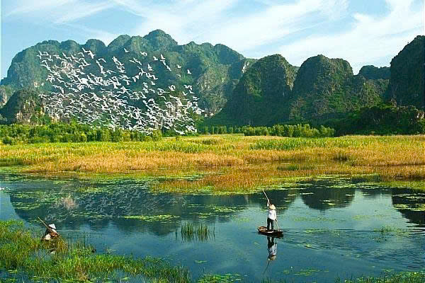 • From 7:00 am – 8:30 am: Early morning, hop aboard a boat in Van Long, the largest wetlands in Vietnam, to discover a diverse mix of flora, fauna, and birdlife. A 1.5-hour boat trip by traditional sampan is the perfect way to explore this area. Van Long’s fauna includes 39 species of birds, reptiles, amphibians, and fish. Some of these species have been classified as globally endangered animals such as the white-breeched langur which can be seen occasionally in the early morning or late afternoon.